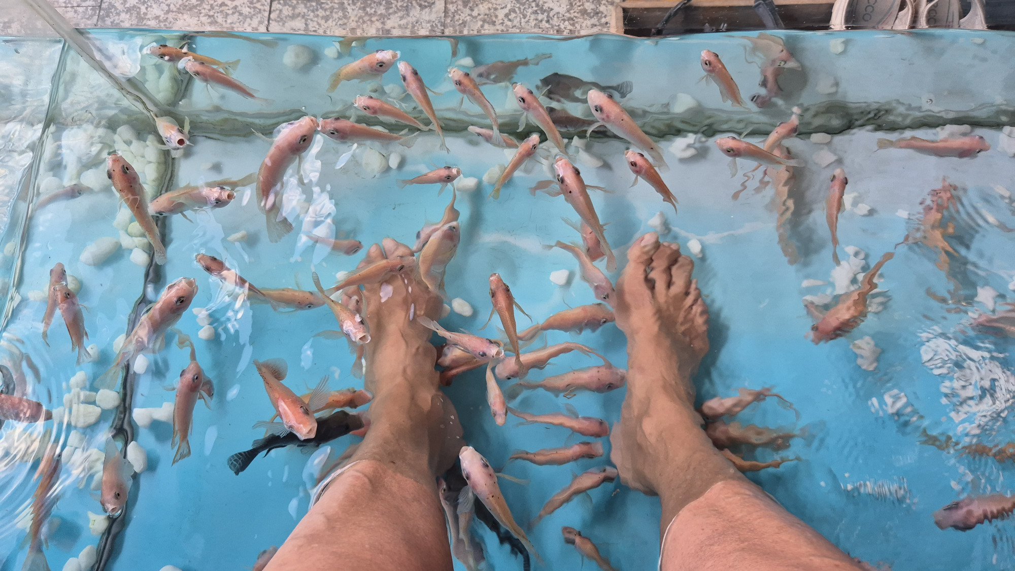Nach einem wunderbaren Ruhetag liessen wir uns, bei einem Bier eine Stunde lang von Doktorfischen unsere aufgeweichte Hornhaut abknabbern. Iris genoss zusätzlich noch Fuss- und Handmassage. Abends, wie fast täglich, genossen wir auf kleinen Plastikkinderstühlen an einem Plastikkindertischchen leckeren Streetfood. Das Essen wurde jeweils frisch zubereitet und kostete für uns Beide nur gerade Fr. 4.--. Die Menschen in Kambodscha sind ausserordentlich freundlich und lieb, wir würden die lächelnde Umgangskultur am liebsten mit nach Hause nehmen.