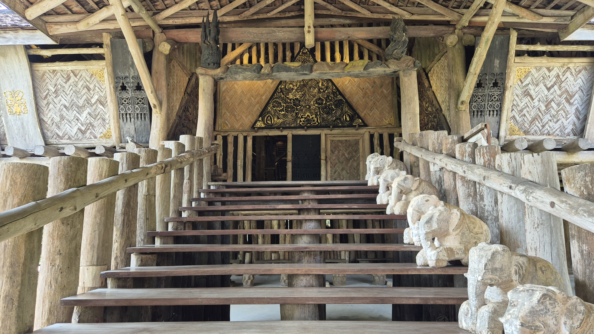 Witer fuhren wir mit dem Motorrad den „Berg“ hoch zur Doi Sa Ngo Village. Abgesehen von leeren Eco-Lodges mit wunderbarem Ausblick übers ganze Land war sonst nichts zu sehen. Hingegen unten im Tal, in der Sridonmoon Art Space Ausstellung, war es dafür doppelt eindrücklich. Zufällig war der betagte Bruder der im letzten Jahr verstorbenen Künstlerin Sriwan Janehuttakarnkit anwesend und hieß uns wärmstens willkommen. In einem riesigen, doppelstöckigen Gebäude und Atelier waren unzählige Werke von Sriwan in jeder Art und Weise zu bestaunen und dies inmitten einem intakten Stück Urwald. Abschließend noch einmal ein sehr feines Abendessen am Mekong, Streetfood bringts!