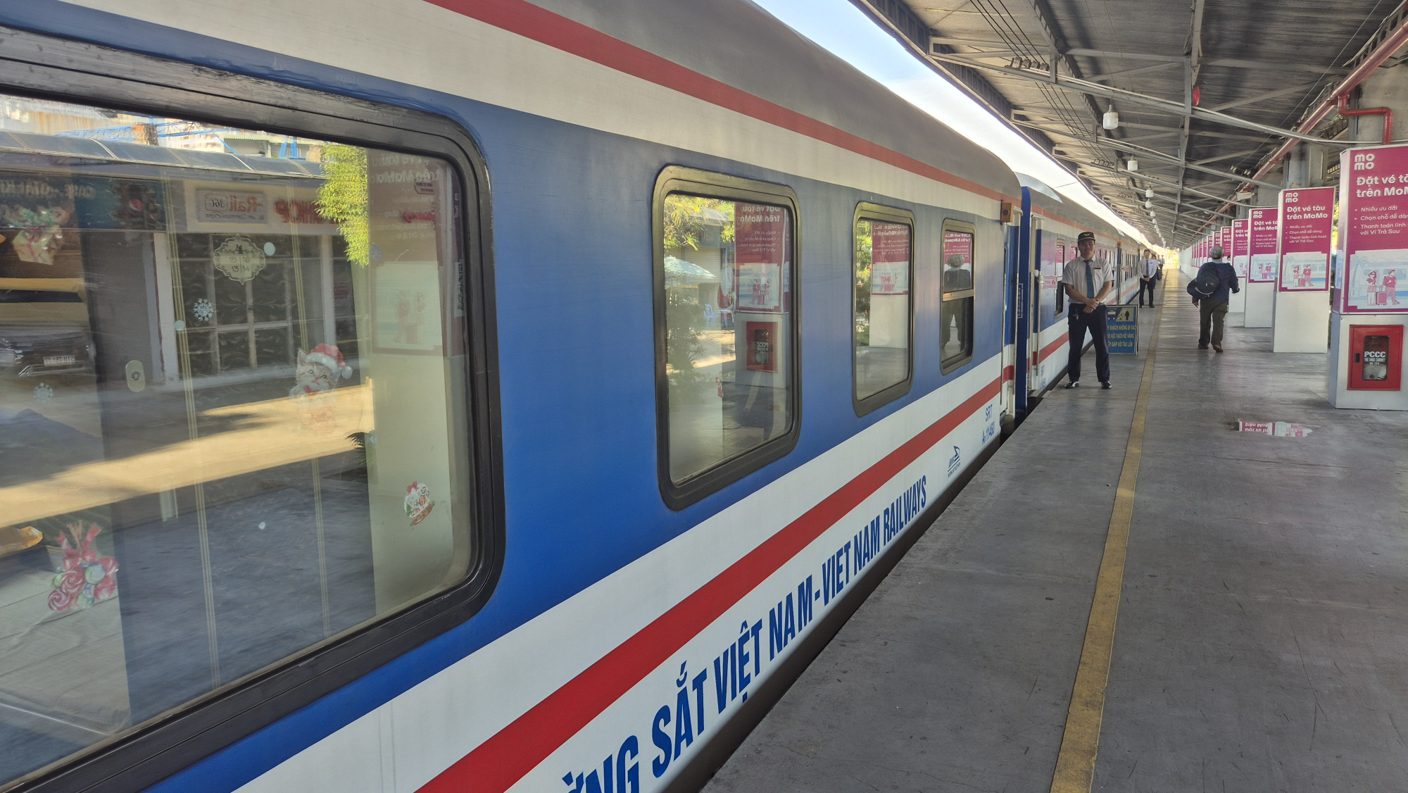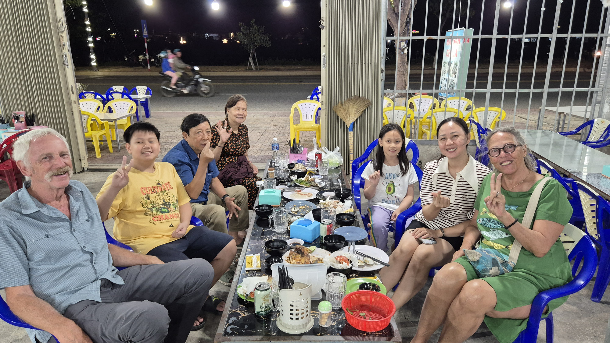 Am 19.12.25 ging die Reise per Zug weiter nach Thap Cham. Vor jedem Wagon stand ein uniformierter Schaffner in weissem Hemd und Krawatte, der uns an unsere vorreservierten Plätze führte. Falls gewünscht, wurde frisch zubereitetes Essen serviert. Nach einer 6h Fahrt, stiegen wir gleichzeitig mit Bisa und ihren 2 wunderbaren Kindern aus. Es war eine herzliche Begegnung. Im Hotel Duc Chinh in Khann Hai hatten wir im 4. Stock ein wunderschönes Zimmer mit Blick aufs Meer sowie einer riesigen Dachterrasse gebucht. Wir waren weit und breit die einzigen Touristen. Wir hatten Glück, dass um die Ecke das einzige offene Restaurant lag. Ein sehr beliebtes Fisch- und Meeresfrüchte Restaurant, das wir gemütlich zu Fuss erreichen konnten.  Zufällig feierten dort Bisa mit ihrer Familie den Geburtstag vom 13j. Bin. Spontan wurden wir eingeladen mit zu essen. Die Vietnamesen sind ein sehr herzliches wie auch gastfreundliches Volk.