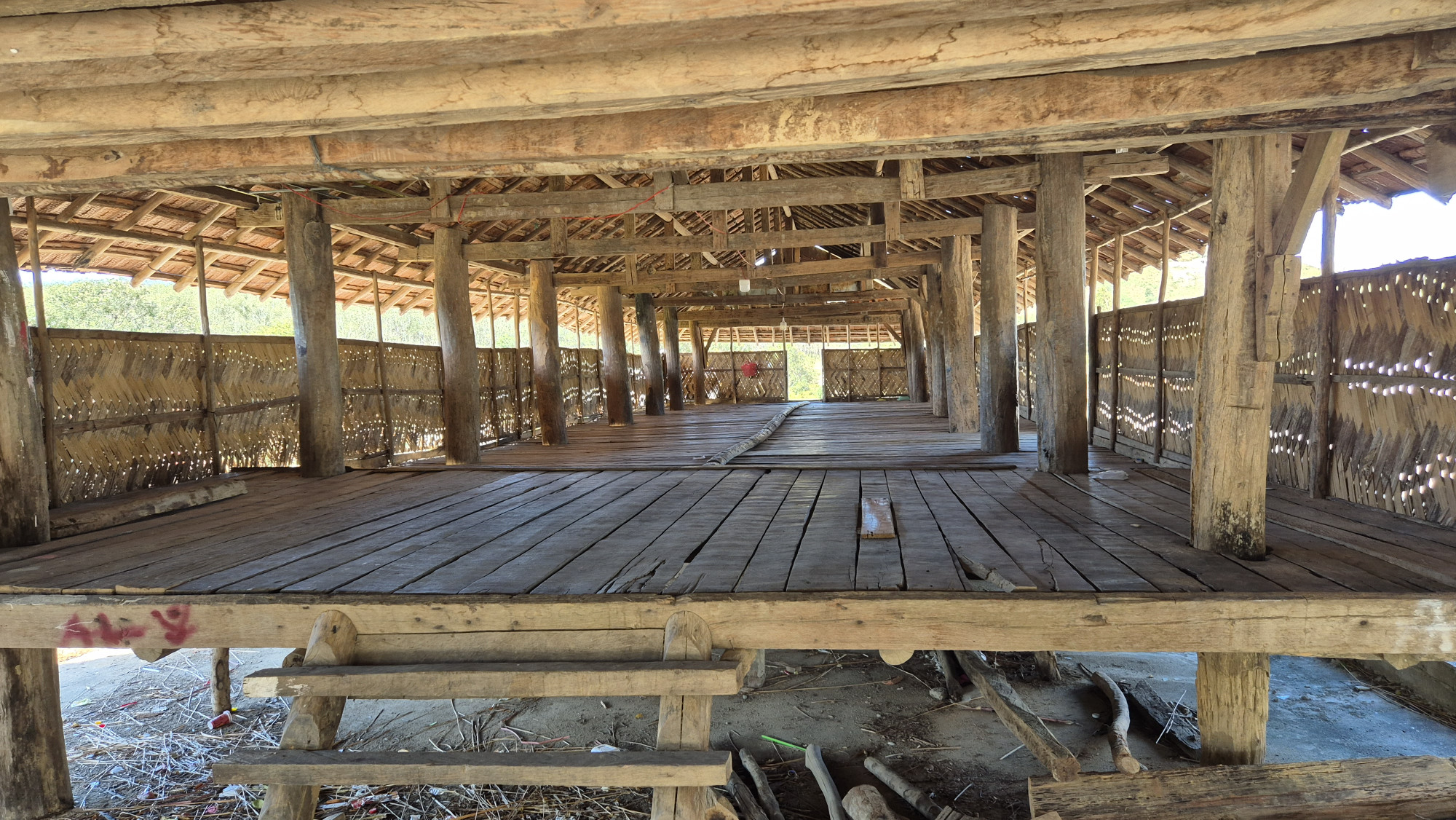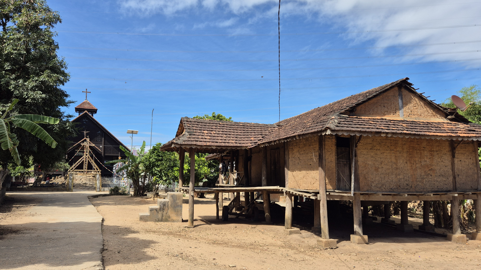 Im nahe gelegenen Dorf Namens Kon k`tu besuchten wir die Bahnar, ein altes indigenes Volk, das ein Teil eines Bergvolkes der Montagnards ist. Die Sprache gehört zu einer Untergruppe der Malayo Polynesischen Sprachgruppe. Die traditionellen Stoffe sind Schwarz rot. Als wir das Gemeinschaftshaus besuchten, wurden wir von den getrennt essenden Frauen sehr freundlich begrüsst. Wie vieler Orts, mischten sich auch hier heidnische wie christliche Bräuche. Vor dem auf Säulen gebauten Gemeinschaftshaus, das nur über einen eingekerbten Baumstamm erreichbar ist, war eine kitschige Krippe aus aufgefüllten Plastiksäcken aufgebaut. Weiter ging die Fahrt über Kautschuk- und Kaffeeplantagen, durch das Dorf Plei Weh Richtung Stausee. Wir sahen Wasserbüffel, Kuhhirte mit Herden und überall fröhlich lachende winkende Kinder, die Hello riefen. Kaum hielten wir an, wurden wir von einer Schar neugieriger Kinder umringt.