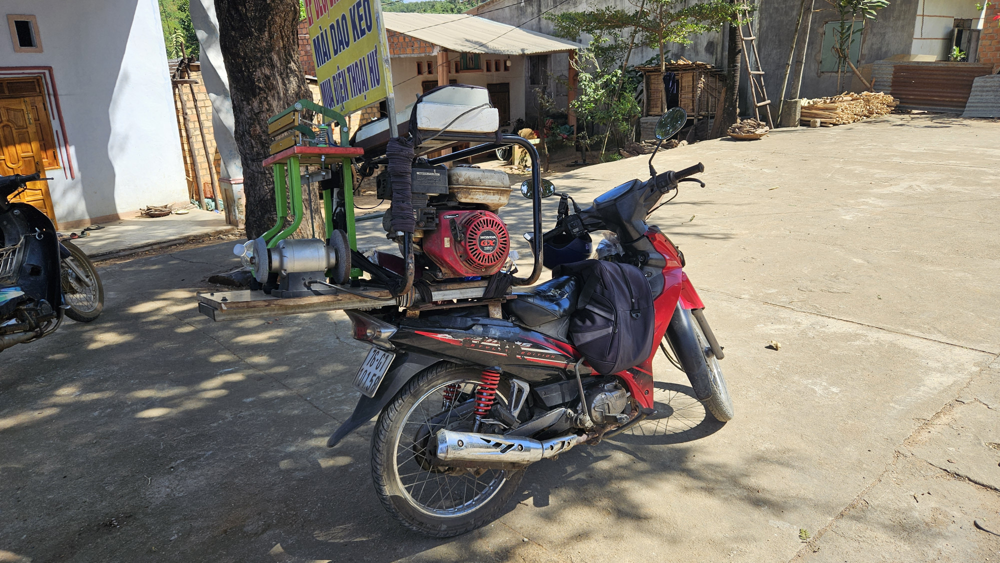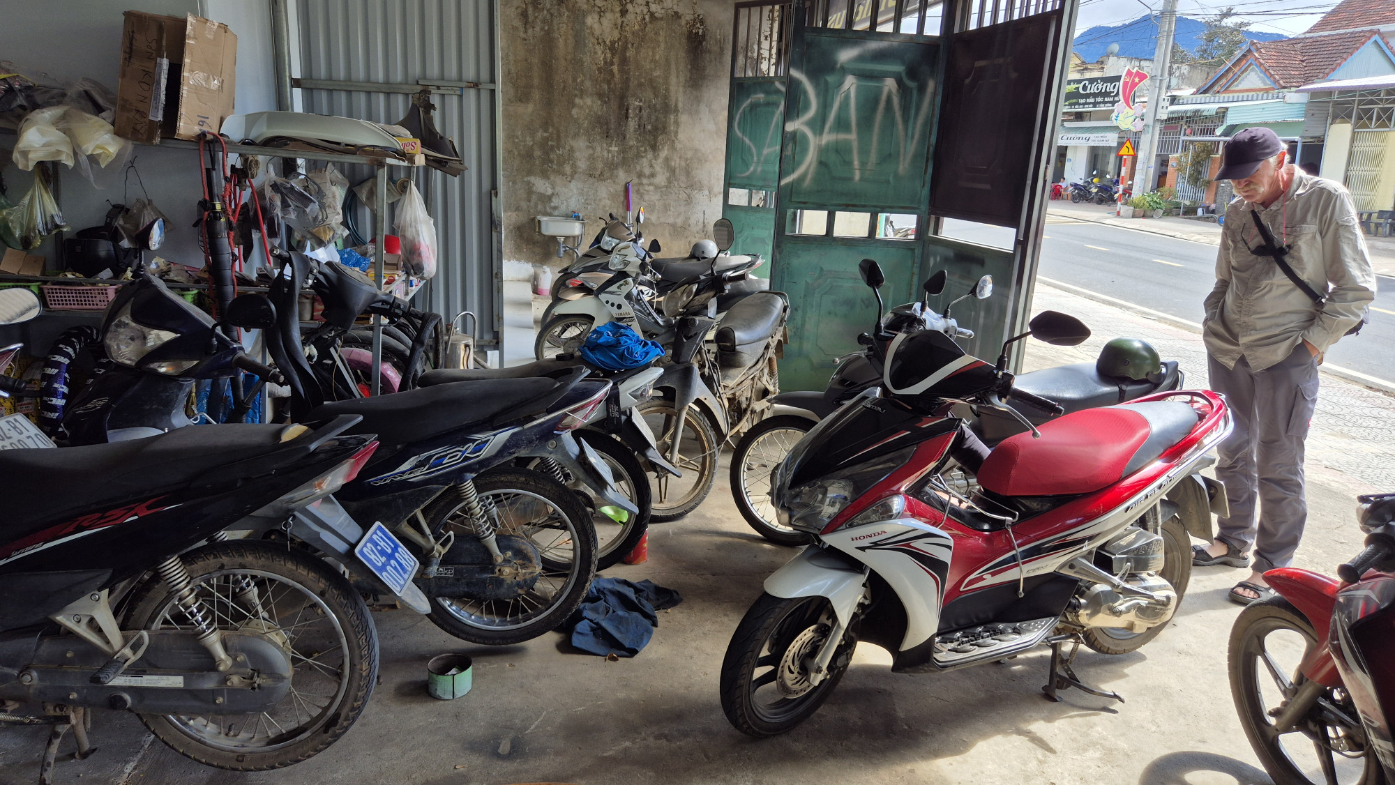 Am 3. Tag auf der Bergfahrt Richtung Mang Den, hatte unser Moto plötzlich keinen Pfupf mehr. Auch war es nicht gerade beruhigend, dass uns fortlaufend in Regenschütze eingepackte Fahrer entgegenkamen. Wir entschieden uns umzukehren, um eine Garage aufzusuchen. Bergabwärts konnte der Roller ohne Motor fahren, so schafften wir es bis zum nächsten Dorf. Dort wusste der Dorfmechaniker sofort was zu tun war, es fehlte das Oel! Beim nächsten Anlauf erreichten wir zwar Mang Den, da es aber in der Zwischenzeit zu Regnen begann, kehrten wir um und besuchten weiter unten bei Tan Lap das Dorf Nam Ha.
