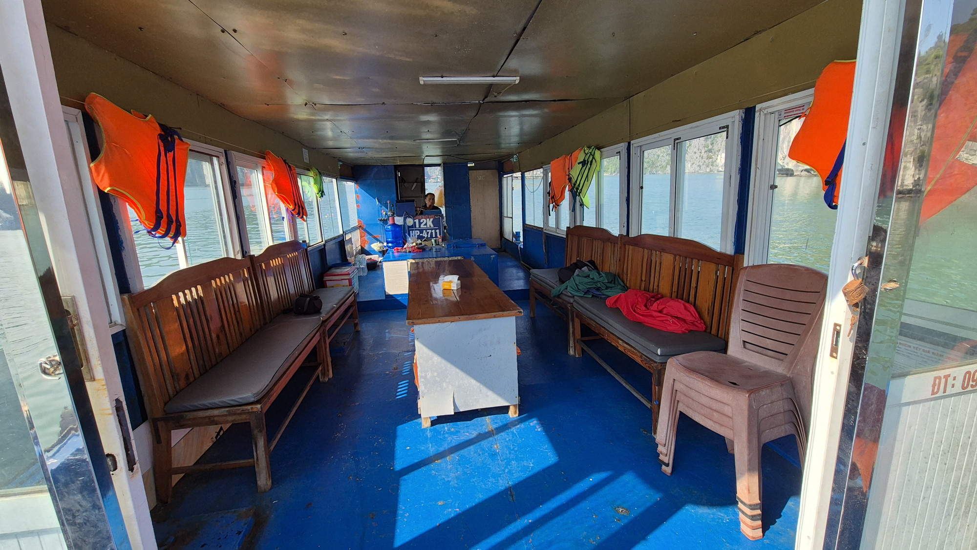 Halong Bay. Dieser unvergessliche Ausflug mit privatem Skipper, der uns auch aufs fürstlichste mit frischem Fisch bekochte war definitiv das Geld wert. Wir genossen die Ruhe und allein mit dem Skipper auf dem Boot zu sein sehr.  Die wunderschönen markanten Felsinseln, Floating Fisher Village, das blaue Wasser und der sonnige Himmel.  Leider versuchte unser Skipper erfolglos, ein auf einer Sandbank festgefahrenes Boot raus zu schleppen.